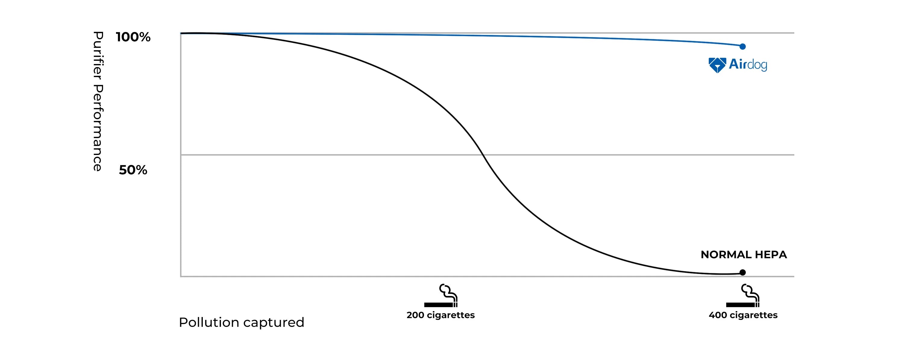 A standard HEPA filter reaches its limit after filtering smoke from about 45 cigarettes. An Airdog TPA purifier, however, can handle the smoke of 440 cigarettes with only a 0.2% drop in performance.